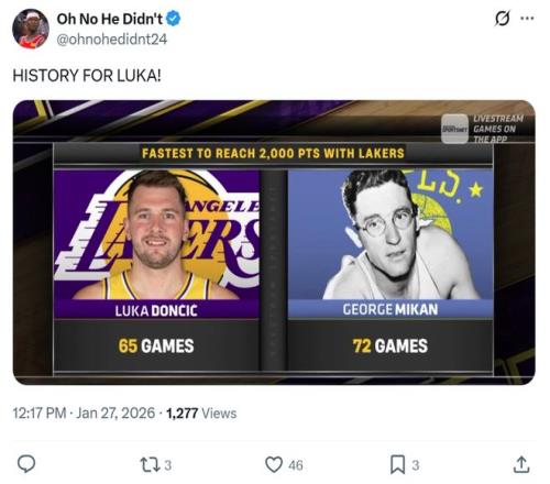 纪录一:东契奇仅花费65场比赛就拿到湖人生涯2000分,超越1972年的乔治麦肯创湖人队史最快;