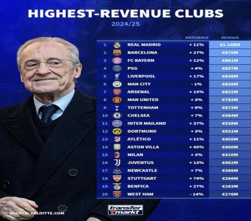2425赛季俱乐部收入榜发布:英超9队上榜西甲靠皇马巴萨撑门面